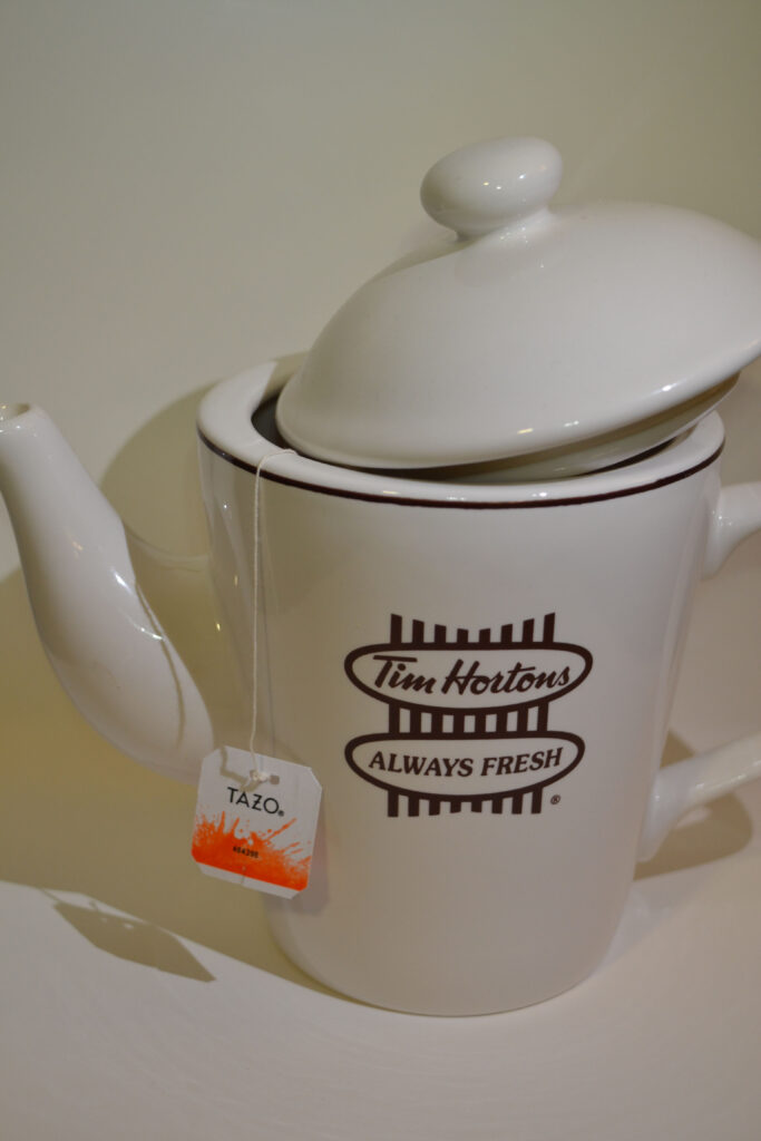 Here is a product shot done as one of my digital photography assignements. I decided to go with my old Tim Hortons tea pot I found at the thrift store and a Tazo teabag hanging out of the pot to give the effect of tea actually being made.